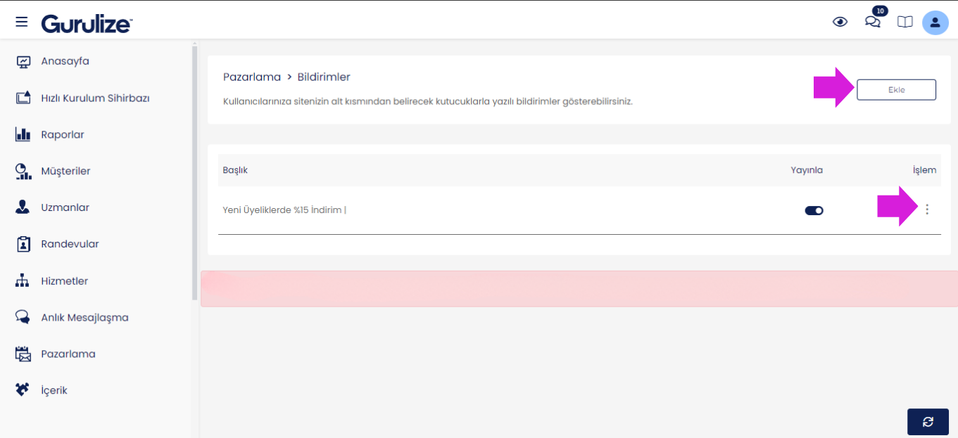 - Sağ üstte bulunan Ekle butonundan yeni bir bildirim ekleyebilirsiniz.