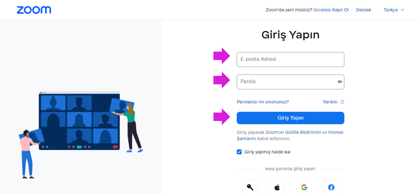 - Açına Zoom penceresinde e-posta adresi ve şifre bilgilerinizi girerek "Giriş Yap" butonuna tıklayın. Zoom hesabınıza giriş yaptıktan sonra Gurulize platformunuza Zoom entegrasyonunuz sağlanmış olacak ve Zoom hesabınızı kullanarak çoklu katılımcılı seanslar düzenleyebileceksiniz.